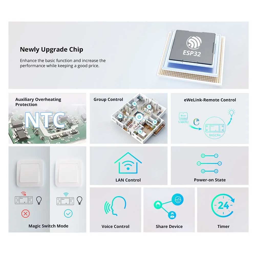 Upgrade your home with SONOFF BASICR4 – a Wi-Fi smart switch powered by the ESP32 chip for faster performance, “Magic Switch Mode,” eWeLink app control, voice commands, and advanced overheating protection.